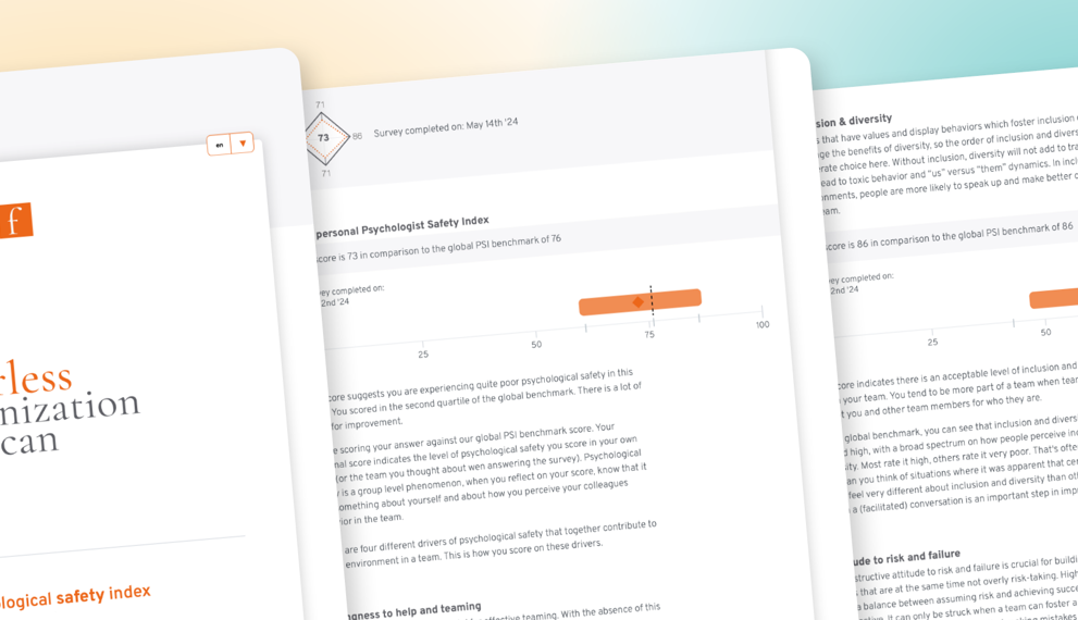 ابدأ بنفسك. من خلال سبعة أسئلة فقط، يساعدك الاستبيان الشخصي المجاني للأمان النفسي على قياس مستوى شعورك بالأمان النفسي، ومقارنته بالمعايير العالمية، والتفكير في العوامل التي تدعمك أو تحدّ من قدرتك على المساهمة والنمو في العمل. إنه سريع، مبني على أبحاث علمية، وخطوة أولى قوية نحو تعاون وابتكار أفضل.